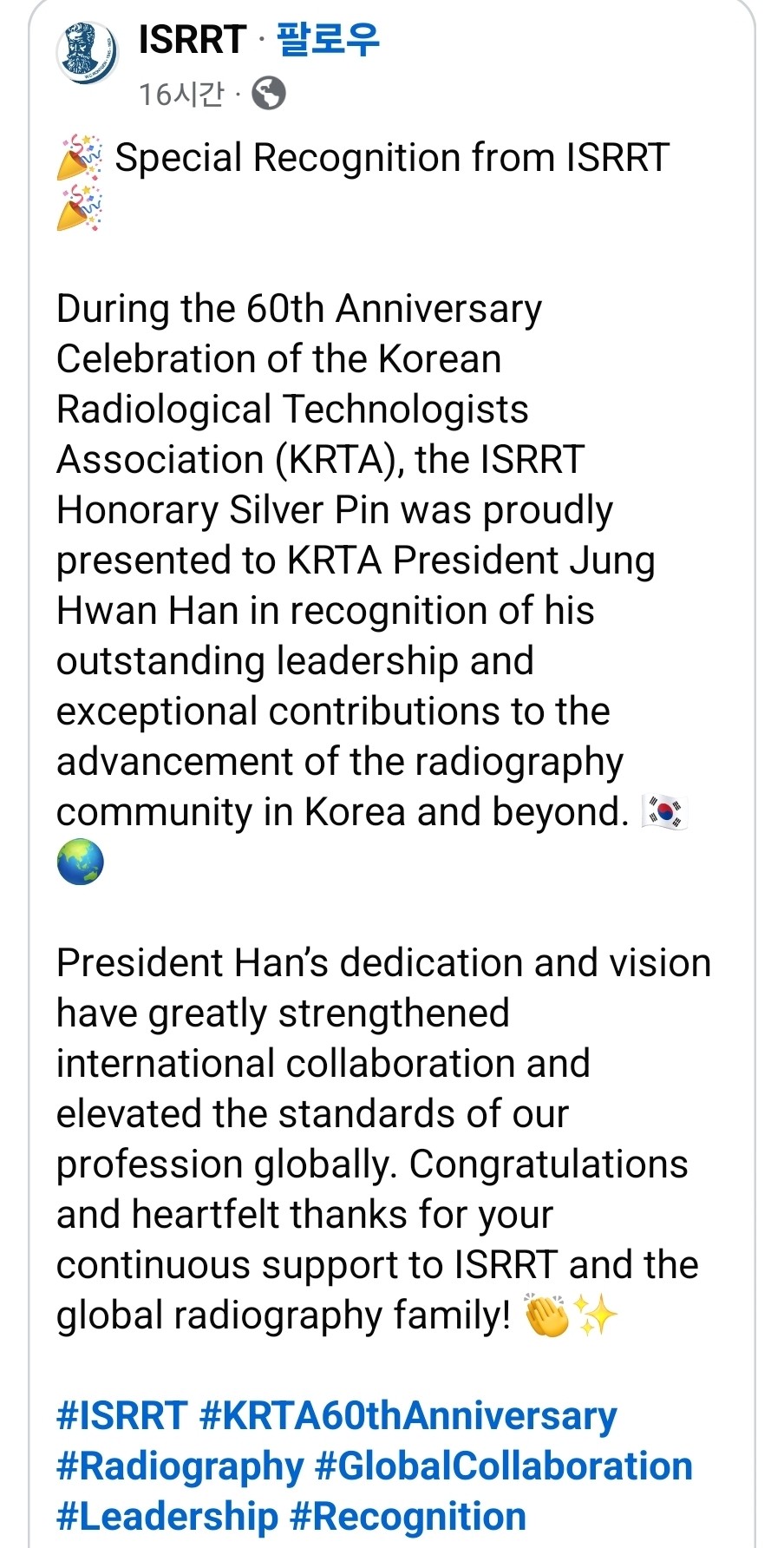During the 60th Anniversary Celebration of the Korean Radiological Technologists Association (KRTA), the ISRRT Honorary Silver Pin was proudly presented to KRTA President Jung Hwan Han in recognition of his outstanding leadership and exceptional contributions to the advancement of the radiography community in Korea and beyond.