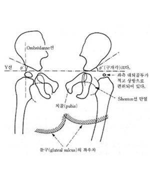 골두출현전의 X-선상 - Shenton 선의 비연속성 - 구개각 (acetabular