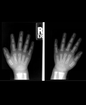 골음영의 감약 골량의 섬세, 거칠다 골간단의 배상변형 예비 석회화증의 소실, 쇄모상 소견 성장판 폭의 증대 골간부의 이중윤곽 Rapid growing end에 변화가 강하다